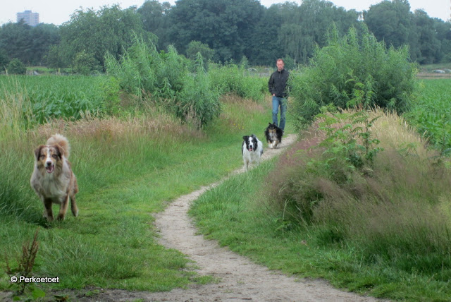Vanochtend was Colin ineens weer stokkreupel aan 2 voorpoten ,dus dat was aangepast uitlaten. Samen met Justin is hij in de auto mee naar het Binnenveld geweest waar hij op zijn gemak kon rondkeutelen en kletsnat worden ;-) Uiteindelijk liep hij weer vrijwel normaal, wat dat toch voor raars is?....